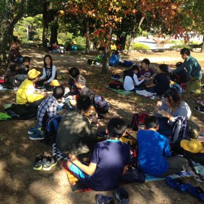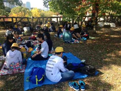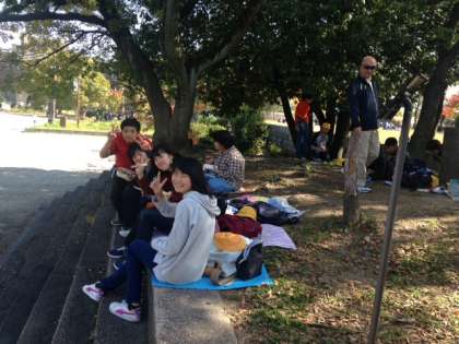 午後の活動の前に昼食をとりました。このあと大阪城内の資料室を見学して、大阪城を写生します。