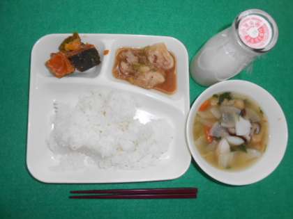 本日の献立は、鶏肉と白ねぎのいため煮、のっぺい汁、焼きかぼちゃのごまだれかけ、米飯、牛乳です。