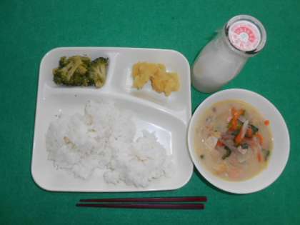 かす汁、ブロッコリーのごまあえ、くりきんとん、米飯、牛乳です。
