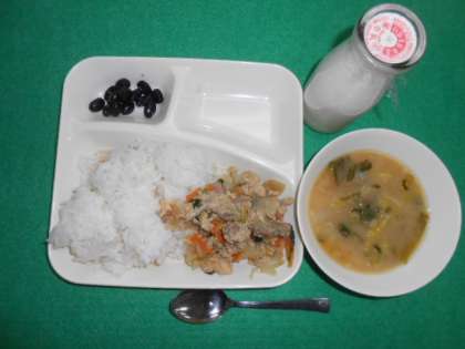 本日の給食献立は、他人丼、みそ汁、黒豆の煮物、米飯、牛乳です。