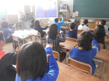 短時間英語活動(モジュール)では、低中学年が、DVD教材を使った、日常会話の聴き取りや文字と音の自然な触れ合いで英語に親しんでいきます。
