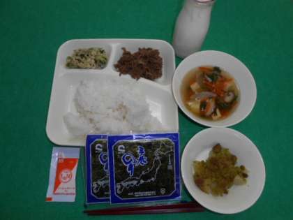内容は、手巻きご飯、(牛肉の甘辛煮、ツナソテー)、すまし汁、和なしのまっ茶クランブルです。