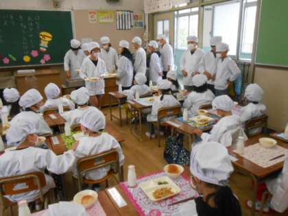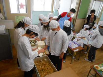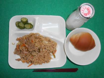 今日の給食の献立は、焼きそば、きゅうりのしょうがづけ、ロールパン、牛乳です。