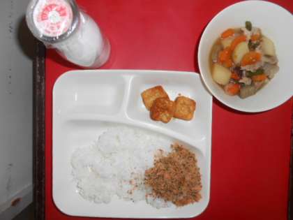 本日12日(木)の献立は、鶏肉とじゃがいもの煮もの、あつあげのしょうがだれかけ、紅ざけそぼろ、米飯、牛乳です。