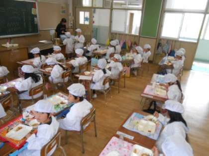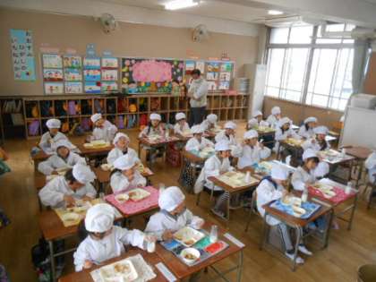 1年生の児童は、毎日笑顔でおいしい給食を楽しんでいます。