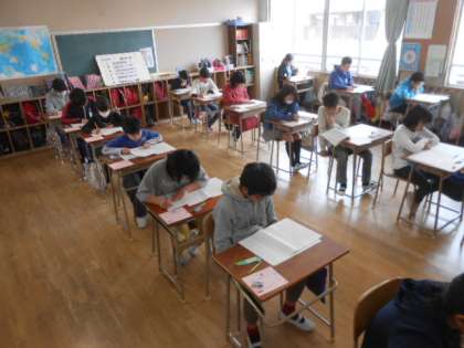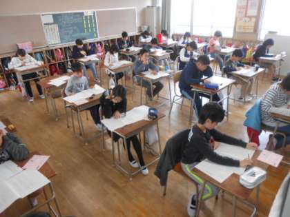 6年生の「全国学力・学習状況調査」を実施しました。調査科目は、国語・算数・理科です。1時間目から5時間目まで1日がかりの調査でしたが、6年生児童は、最後までしっかり取り組んでいました。