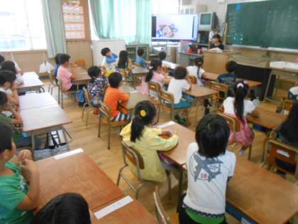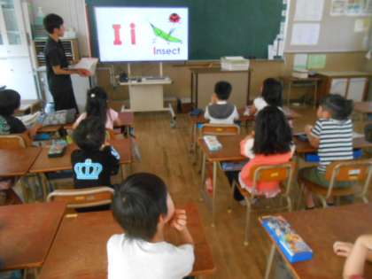 今日(5月1日)から全学年で毎週火曜日、朝の時間(モジュール)に英語活動をします。英語の発音に触れ、英語のリズムや音声に慣れることをねらいとしています。高学年では、アルファベットの読み書きへと発展していきます。