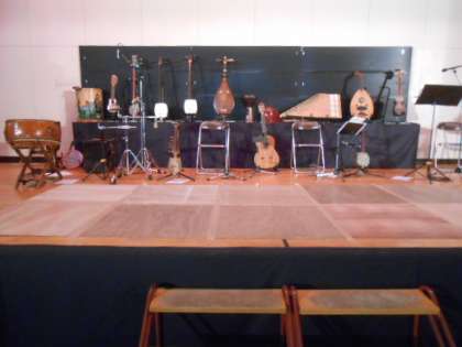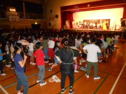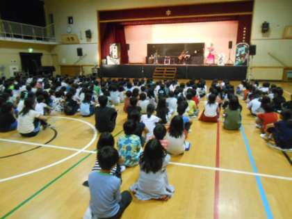 稲岡満男&音楽工房によるわくわく音楽劇「おもしろ民族楽器・ふしぎ旅」を全校児童で楽しみました。