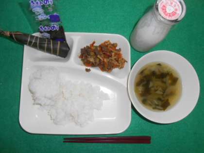 牛肉のちらしずし、きざみのり、すまし汁、ちまき、米飯、牛乳です。