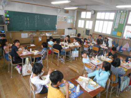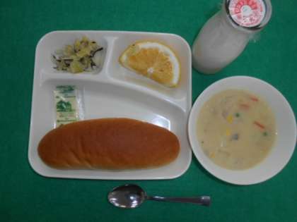 本日の献立は、コーンクリームシチュー、キャベツのひじきドレッシング、河内ばんかん、大型コッペパン、マーガリン、牛乳です。