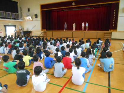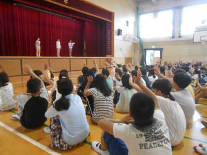 今朝の児童集会では、スリーヒントゲームをしまいした。集会委員会の児童が出題し、フロアーの全校児童が手を挙げて答えました。1年生にも解ける問題で、やさしい思いやりのある集会でした。