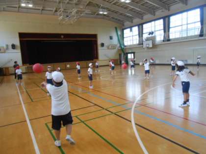 両手で、ドッジボールを支えて、片手でボール投げたり、受けたりしました。