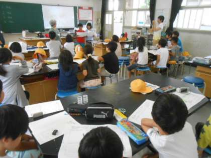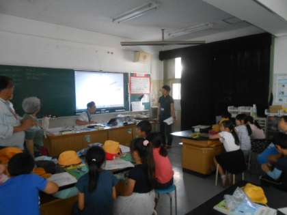 校庭、学習園、植込みなどでの生き物探しでは、日ごろは雑草とひとくくりで言っていた植物についてきちんと名前を教えてもらい、昆虫や小さな生物にとっては、大切な存在であることを学び関心を持って説明を聞いていました。3、4年生の児童は、理科室で記録したことを互いに確かめたり、採取した生き物について各班で発表したり、拡大映像で詳しい説明を聞いたりして学びを共有しあいました。