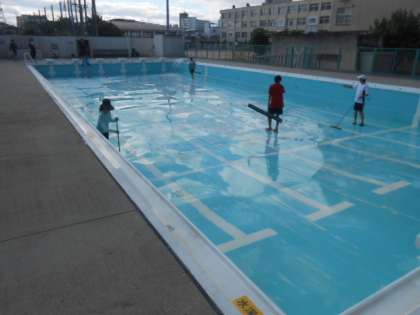 午後、全教職員で、プールを清掃しました。プール本体のほか、更衣室、機械室、用具倉庫、洗体槽、プールサイドなどをきれいにしました。6月21日(木)プール水泳学習開始に備え、準備を進めています。ご家庭でも水泳学習に必要な用具の準備をよろしくお願いします。また、すべての物に名前を必ず書いていただきますようにお願いいたします。