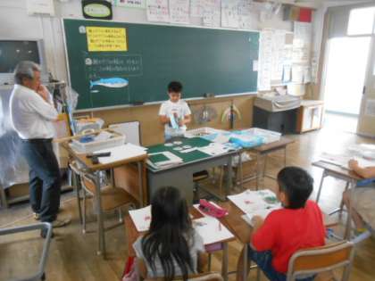 「親クジラの体長は15mで、子クジラの体長は3mです。親クジラの体長は、子クジラの体長の何倍ですか」の問題の解き方を話しあい、それぞれの考え方を発表しました。 倍を求める場合は、わり算を用いるとよいことを理解しました。