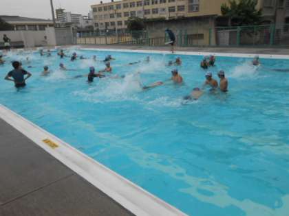 水中で水慣れの運動をしたのち、縦コースを使って、音楽のリズムに合わせて初泳ぎをしました。
