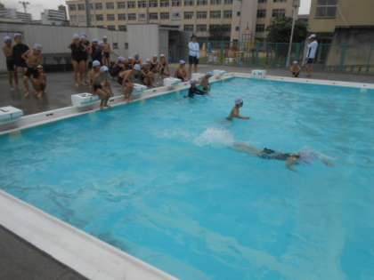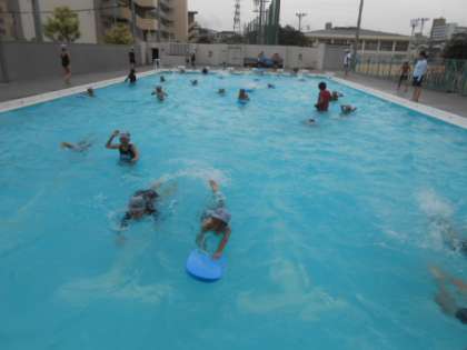 準備運動のウォーミングアップで体温を上げ、水慣れの運動をして、縦コースを使って、水中歩行やビート板を使ってバタ足、クロール、平泳ぎなど自分に応じた泳法で初泳ぎをしました。