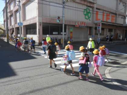 今月7日は、土曜日のため本日7月9日に見まもるデーとなりました。ここ数日の記録的な長雨が、ようやく終息し今朝は、晴天になりました。子どもたちは、元気に集団登校してきました。今週は、日中の気温が30度を超す予報です。交通安全を見守っていただいている見守り隊の皆様には、暑さにも気を付けていただきますようお願いします。