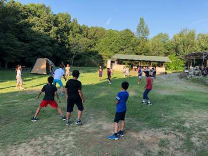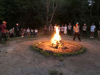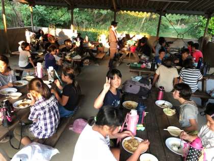 広場でドッジボール、カレーライスの夕食、キャンプファイヤーを楽しみました。