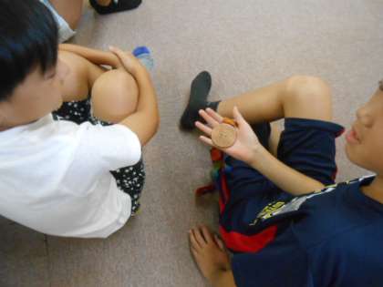 また、オリンピックの銅メダルを披露していただき、児童一人一人が興味をもって手に取り、憧れのまなざしとともに触れていました。