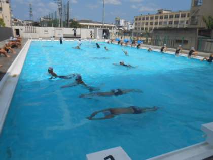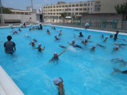 連日、日中の最高気温が35度を上回る日々が続き、午前9時でも気温30度に達していますが、プールでの活動に際して、休憩と水分補給を十分に取りながら、安全に十分な配慮をして指導しています。