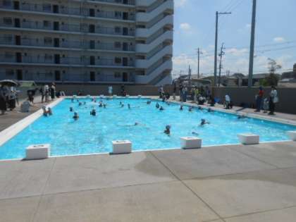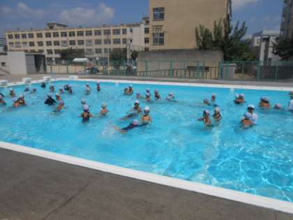 リズムに合わせて、歩いたり、いろいろな姿勢で浮いたり、友だちに手を引いてもらったりして水中の動きを楽しんでいるところを参観していただきました。