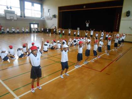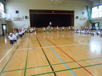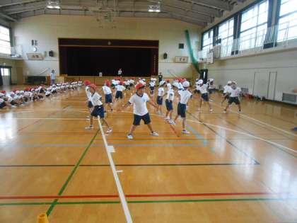 1、2年生が、合同で運動会の団体演技の練習をしました。2年生が先にお手本となって演技をした後、1年生が2年生に演技を見てもらいました。教わったことを一生懸命に試みている姿がすてきでした。