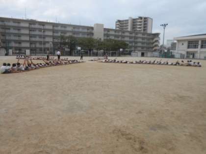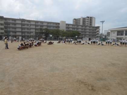 高学年は、運動会団体演技の練習に励んでいます。全員で動きを合わせる技に取り組んでいます。また、集団で移動する演技の練習では、大きな声でカウントを取りながら動きが揃うように頑張っていました。