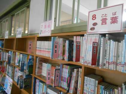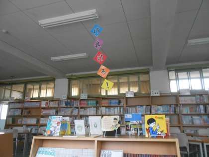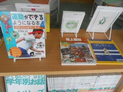 分類表示を新しく付け替えていただき、見やすくなりました。また、図書館の真ん中に運動会に関連したコーナーを作っていただいています。