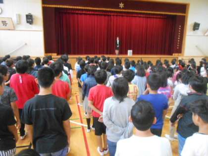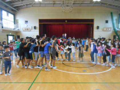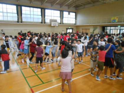 児童集会の前に、教育実習が本日で終わりますので、実習生より全校児童にあいさつをいただきました。集会では、じゃんけん列車をしました。1年生から6年生までが、仲間の行列が伸びるのを楽しんでいました。