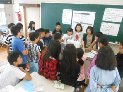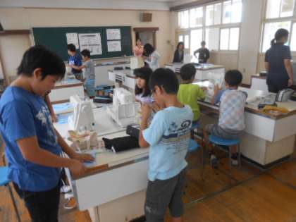 5年生が、糸と針で手縫いのしかたを一通り学習して、今日の家庭科では、ミシンの基本的な使い方について学びました。