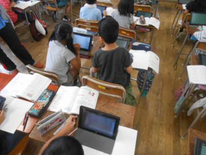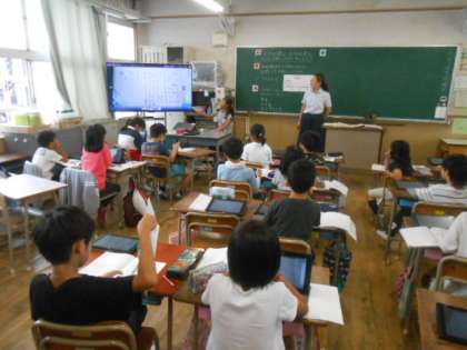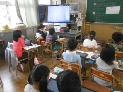 子どもたちは、今日の授業で、「3けた×1けたの筆算の仕方について理解し、その計算ができる。」をめあてに自分が考えたことをノートにまとめ、タブレットPCを使って発表しました。