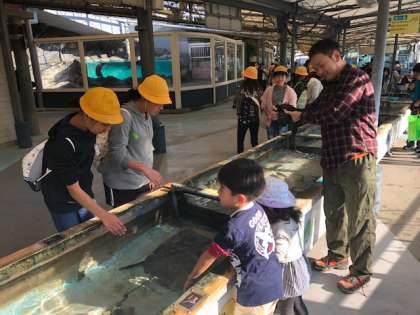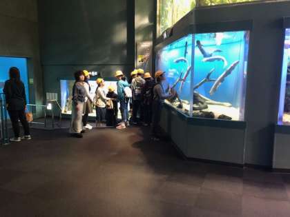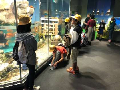 鳥羽水族館をグループで見学しています。世界中の珍しい魚や動物に出会い楽しんでいます。