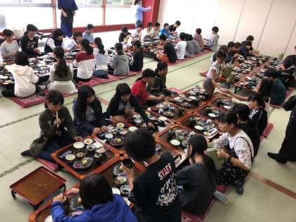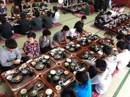 6年生全員、元気です。スペイン村での活動に備え、しっかり食べています。