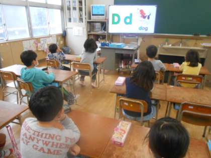 (アルファベットの名前や形、音に慣れ親しむ。)