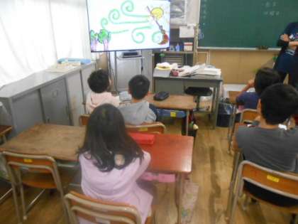 (日常的な場面でのやりとりを中心として話。映像を見ながら、意味を推測し、言葉とつなげる。