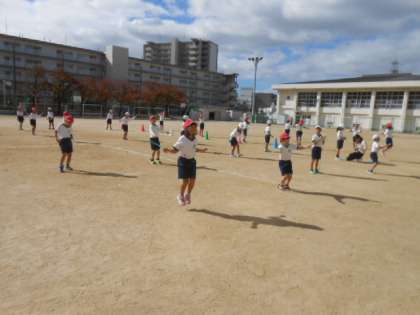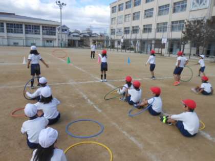 2年生が、体育学習「体つくり運動」用具を操作する運動遊びで縄跳びと輪に取り組んでいます。なわとびは、二重とびを目標にして一生懸命に練習していました。