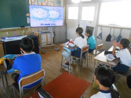 毎週火曜日は、全校でモジュール英語活動をしています。登校して8時30分のチャイムが鳴って各学級での健康観察が終わると、大型テレビを使ってこの活動が始まります。英語に楽しく触れ、親しんでいます。