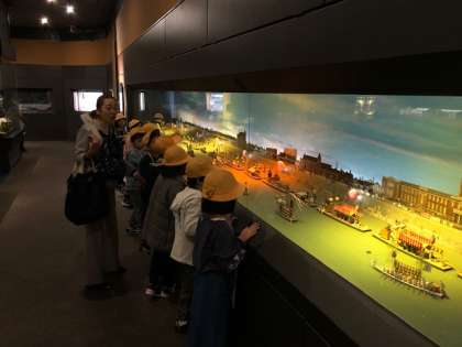 大阪くらしの今昔館では、ジオラマで明治、大正、昭和の各時代の生活の様子が細かなところまで再現し展示されています。場面展開の仕掛けが動くたびにより興味深く見て学習を楽しんでいました。