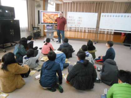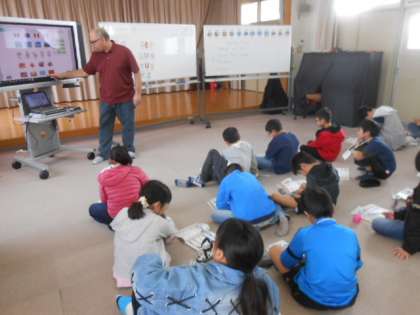 エリック先生が、学校生活の思い出を英語で子どもたちに問いかけ、子どもたちは、それぞれにその問いに英語で答えていきます。