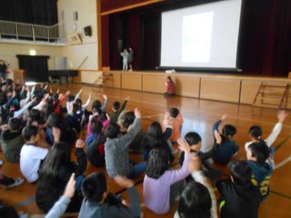 20日、朝の児童集会で、給食委員会が、活動の様子をクイズも交えて楽しく発表しました。給食献立についての放送や給食後の食缶、牛乳パックの片づけについて映像を使って分りやすく説明してくれました。