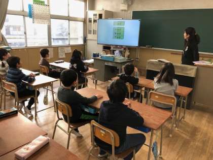 英語モジュール学習2年生、3年生、4年生の様子です。DVD教材の映像を視聴して、英語を聞き取ったり、発音をリピートしたりを繰り返して、英語に慣れ親しんでいきます。