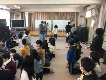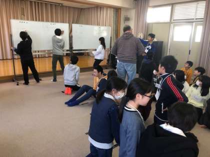 6年生は、今日の外国語活動で最後になります。1、2組合同でエリック先生が出題した英文をリレーでホワイトボードに書き取るゲームを楽しみました。中学校へ進学しても英語学習を楽しんでほしいと思います。