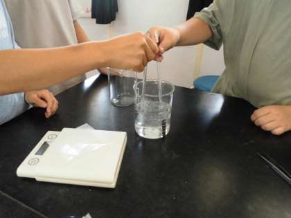 水溶液の性質について学習中の6年生は、入浴剤作りに挑戦しました。まずは、酸性のクエン酸水とアルカリ性の重曹水を混ぜると、安全な中性になることを確かめました。まぜると、シュワシュワと泡がでて、びっくり! 次はいよいよ入浴剤作りです。クエン酸、重曹をはかりとり、オイルやアルコールスプレーをかけてこねます。初めはサラサラしていましたが、講師の先生の話を聞いているうちに固まりました。「コツンっていった!」と子どもたちも驚いていました。今日、お風呂に入る時に使うのが楽しみですね。