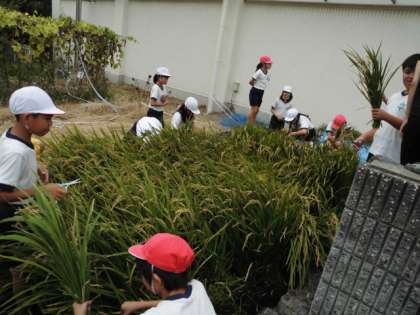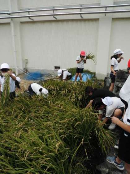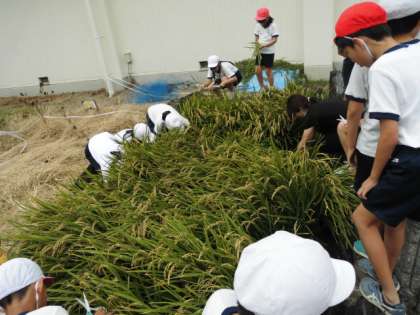 たくさん実った稲穂をいよいよ刈り取る時期がやってきました。子どもたちがハサミを使って稲を刈り取り、ひもで結んで、この後はさがけをして、2週間ほど乾燥させます。今年は豊作でした。