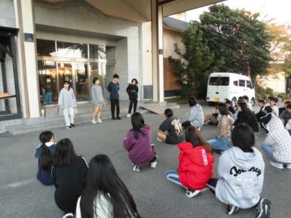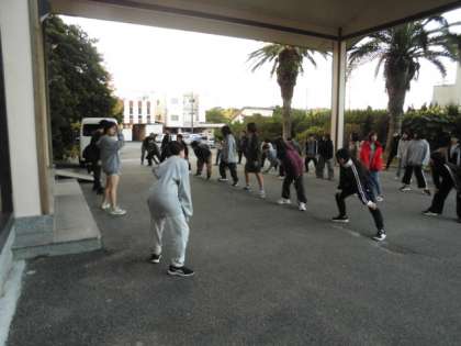 ホテルの前で朝の会を行いました。校長からの挨拶のあと、みんなで体操をして身体を動かしました。今日もかんばりましょう。