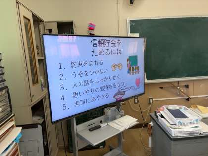 保健室の先生から、「信頼貯金通帳」についてのお話を聞きました。友達に親切にしたり、約束をきちんと守ったりしていると、みんなの心の中にある信頼貯金通帳にどんどん貯まっていくんだと、分かりやすく教えていただきました。1,3年生は来週の月曜日になりますが、それ以外の学年では今日までにお話をきいています。各家庭でも、お子様がどんなことを頑張ろうかと思ったのか聞いてあげてください。よろしくお願いいたします。
