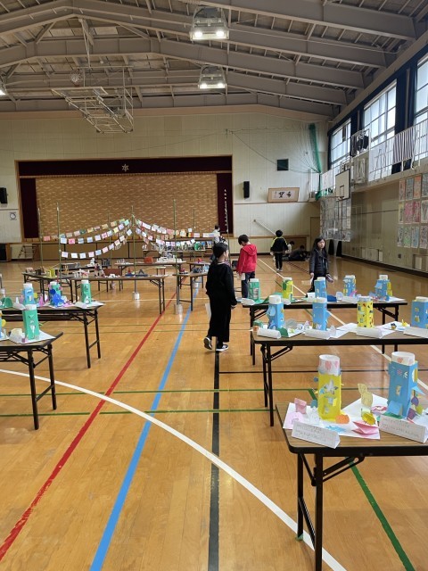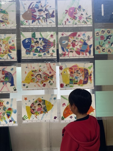 4年生が校内で行われている作品展に行き、他学年の子どもたちの作品を鑑賞しました。それぞれの学年の工夫がよく表されており、子どもたちは興味深そうに作品をみて、「すごいね!」「どうやって作ったの?」と一つ一つの作品をじっくりとみている姿が見られました。
