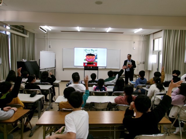 4年生に向けて、校長より平和学習の授業を行いました。「みんながラーメンを食べている、この時」、世界では、紛争や貧困で苦しんでいる子どもたちがいることを伝え、平和について深く考えてもらいました。