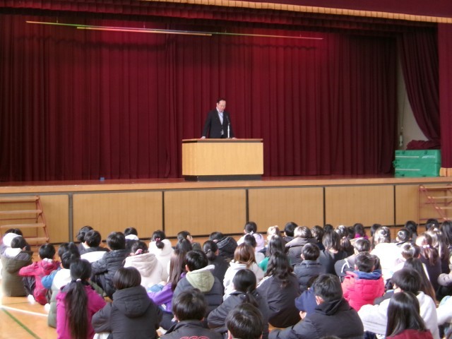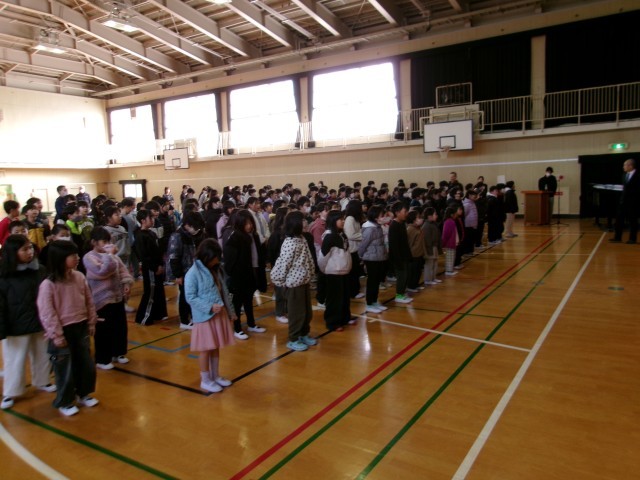 3学期が始まりました。始業式で校長からは、新年のあいさつで、なぜ「おめでとう」と声をかけるのか、その理由、意味について考えてもらう話をしました。生活指導の先生、保健委員の児童の話が続き、最後に校歌をみんなで歌って式をしめました。今日からのまとめの学期、みんなでがんばりましょう。